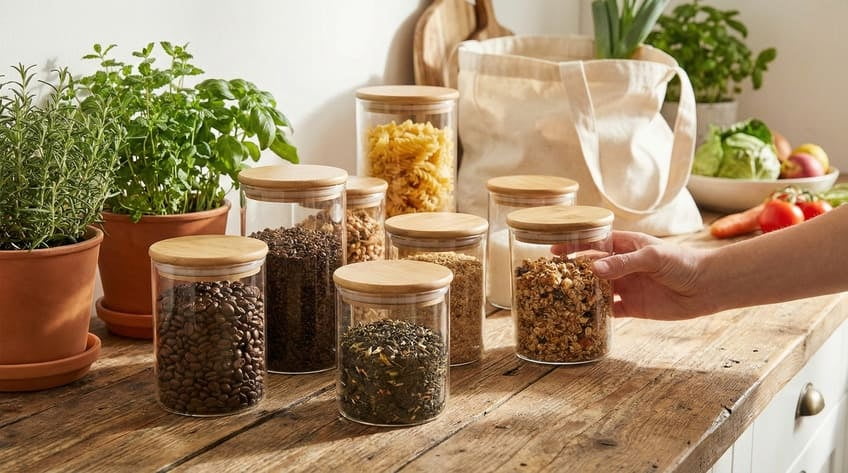 Glass jars with bamboo lids are among the most sustainable and eco-friendly storage options3. Glass is recyclable and inert; bamboo is renewable and biodegradable4. This combination offers low environmental impact and premium appeal.