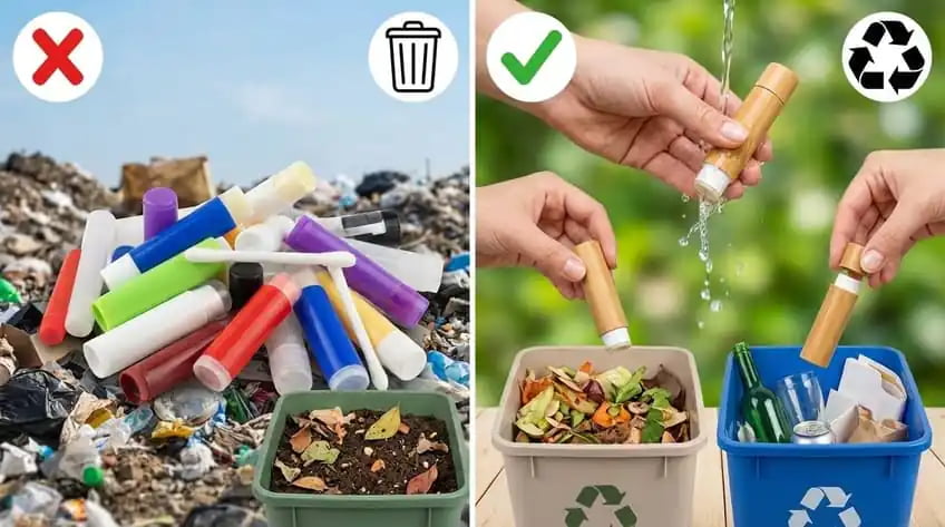Plastic lip balm and gloss tubes are rarely accepted in regular recycling. Bamboo containers designed for disassembly can be composted or recycled—just clean, separate, and follow local disposal rules or take-back programs.