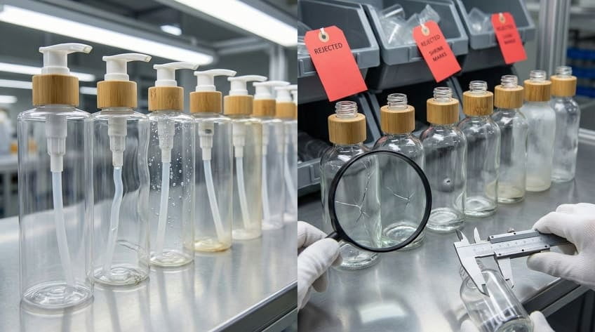 Check for uneven thickness2, seams, bubbles3, cracks, sink marks4, warping5, and color issues—these defects in plastic and glass can weaken lotion bottles and cause leaks, contamination, or breakage.