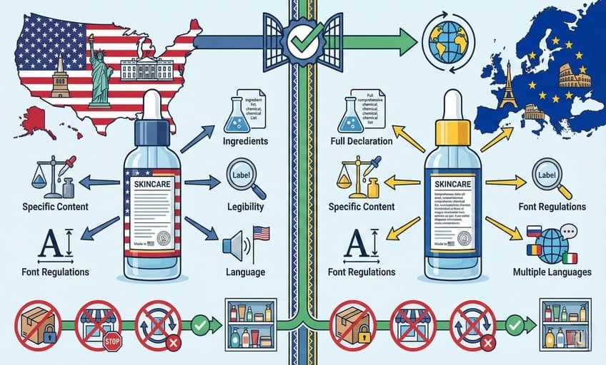 US and EU regulations2 demand clear, accurate labeling with complete ingredient lists3, specific content, and legible details4—including strict font, language, and packaging guidelines5 for each market.